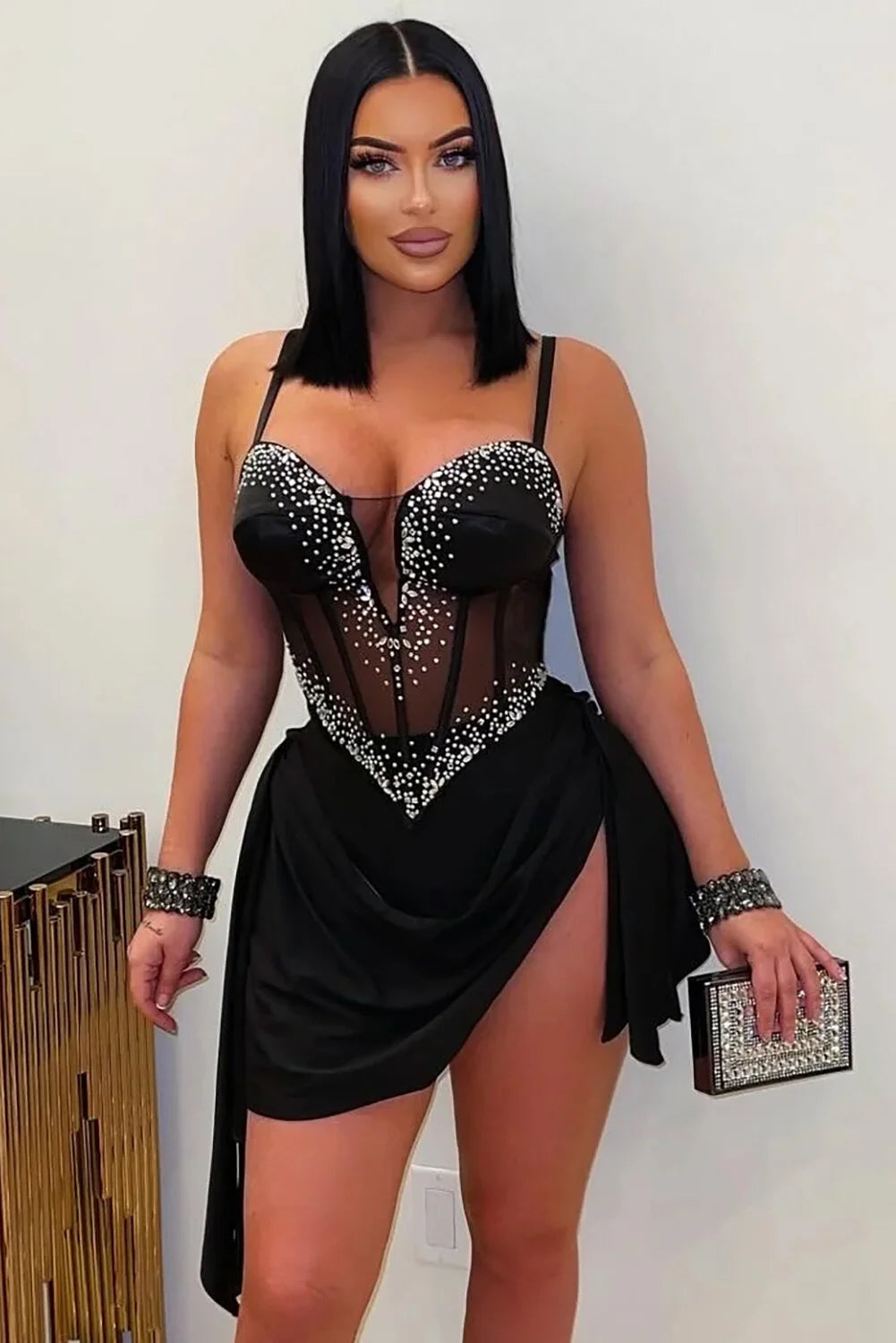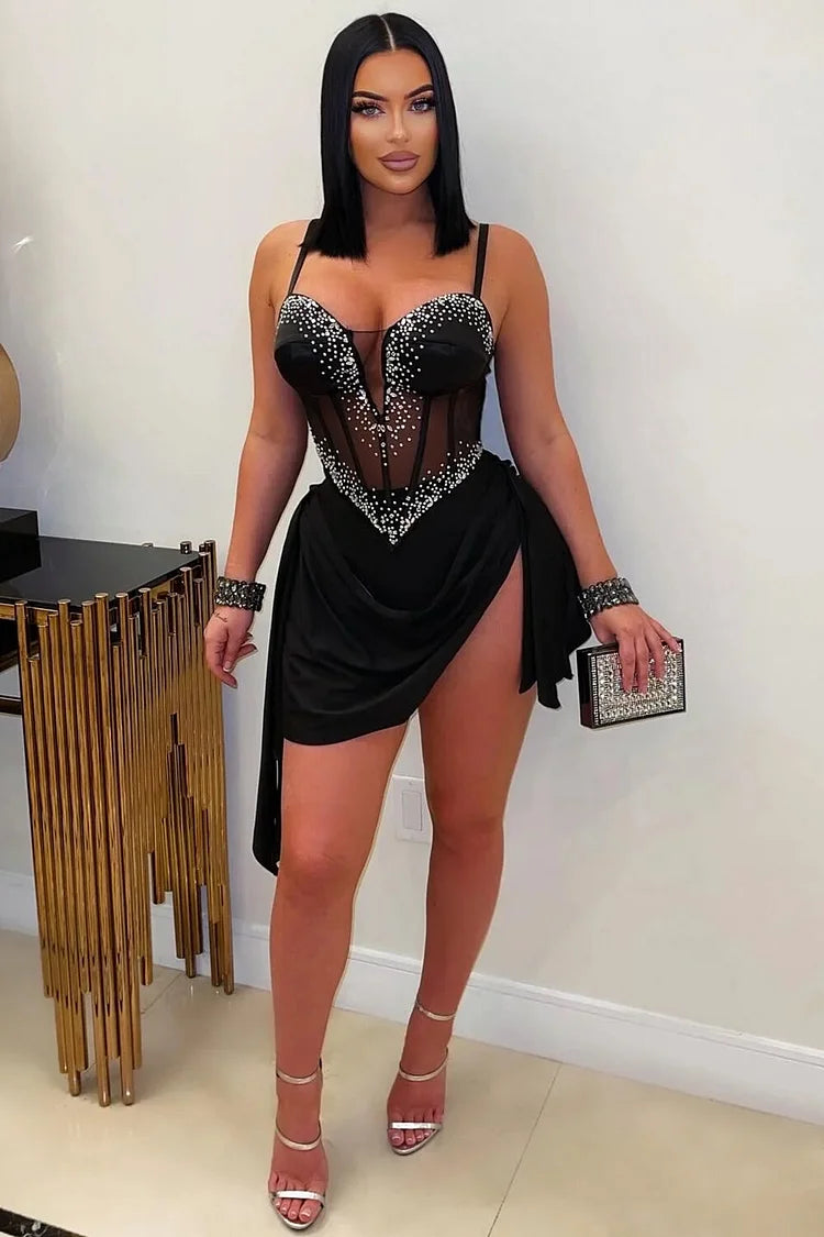 Rhinestone Decor Mesh Corset Ruched Slit Hem Party Slip Mini Dresses-Black